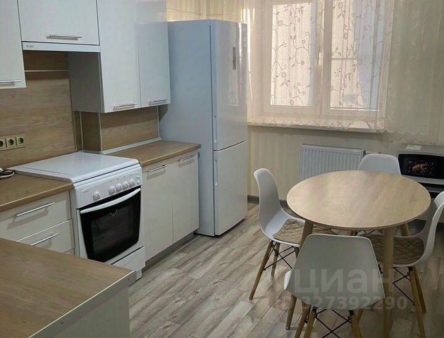 Просторная кухня с газовой плитой, стиральной машиной, микроволновой печью, чайником, столом, стульями, набором посуды и приборов.