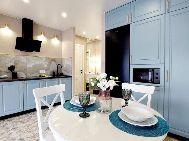Кухня: кухонная мебель, индукционная плита, холодильник, микроволновая печь, стиральная машина, кондиционер, наборы посуды. Все это сделает приготовление пищи быстрым, приятным и не утомительным.