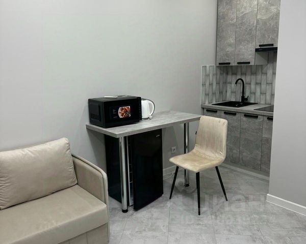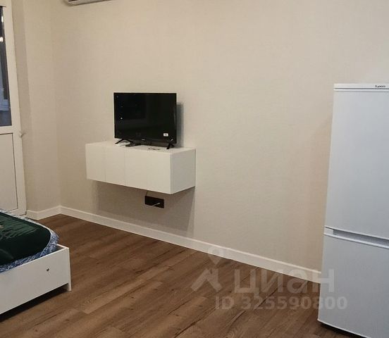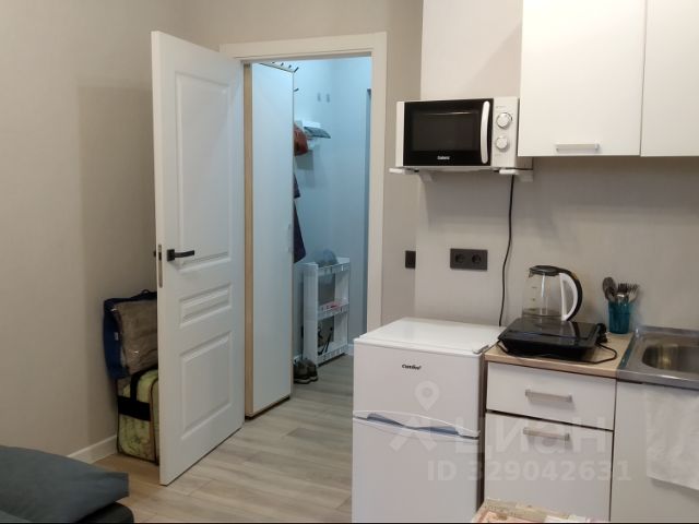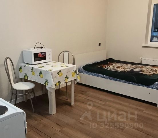 Студия оборудована: кровать (1,6мх2м), матрас (мягкий), стиральная машина, сушилка, кухня, электрочайник, электро плиита, холодильник, пылесос, шкаф, стол раскладной обеденный, табуретки, стол рабочий, роутер с подключенным вайфай, сплит, летом установим водонагреватель (как запасной источник горячей воды).