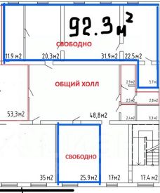 Планировка кабинетная, опен-спейс 95 кв.м и два кабинета на 29 кв.м и 36 кв.м.