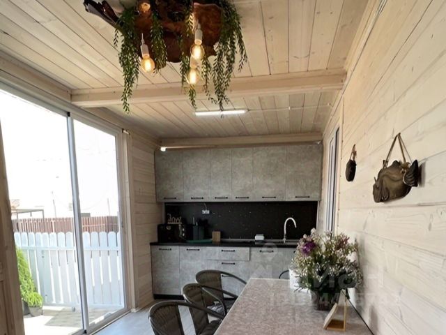 На террасе мягкие окна и шторы, кухня, столик и лавки, холодильник, микроволновка, мультиварка, чайник, для вашего удобства будет еще электрическая плита, сковородка и кастрюля