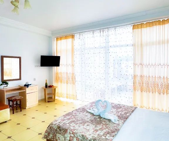 "Маленькие Афины" - Витязево считается самым лучшим курортом для семейного отдыха в Краснодарском крае. На берегу Чёрного Моря расположен настоящий замок, чей архитектурный стиль и убранство удовлетворит вкус самого взыскательного ценителя. Просторный роскошный номер с панорамными окнами и огромной террасой, выполненный в классическом стиле, оборудованный до мелочей, позволяет погрузиться в комфортный отдых или романтическое свидание. Новые постельные принадлежности, махровые халаты, текстиль премиального качества, наборы для чая и кофе, кондиционер, холодильник, большой шкаф-купе, led телевизор, кровать super king size, а также 2 раскладных 1,5 спальных диван-кровати. Из номера имеется выход на собственную веранду под открытым небом с качелями и кофейной зоной. Терраса декорирована просторным эркером с зубцами, с нее открывается панорамный вид на центр Витязево и приятно освещается в вечернее время. Номер идеально подойдёт для новобрачных или романтической фотосессии. У замка имеется собственная бесплатная парковка для гостей. До моря около 15 минут неспешным шагом. Ближайшие достопримечательности: Храм Святого Георгия Победоносца Бульвар Паралия Аквапарк "Олимпия" Дельфинарий и океанариум "Немо" Парк Развлечений "Funtime" Парк развлечений "Византия" Open Air "Жар" Бугазская коса Долина Лотосов Кипарисовое озеро Абрау-Дюрсо