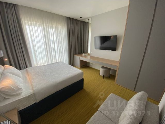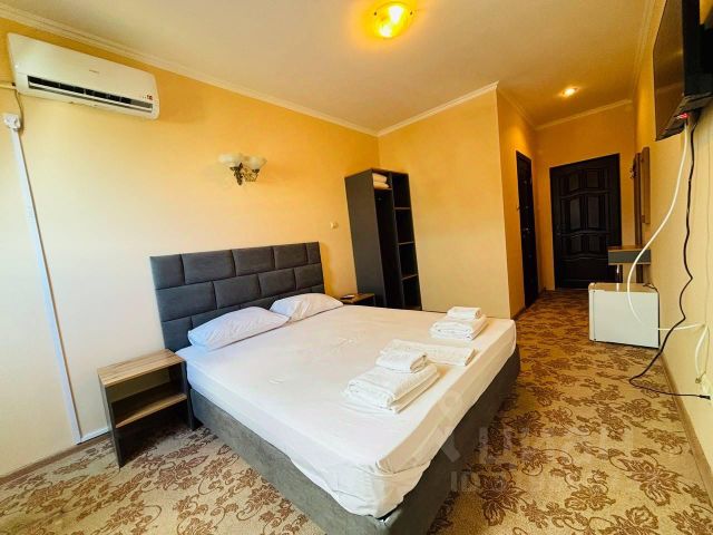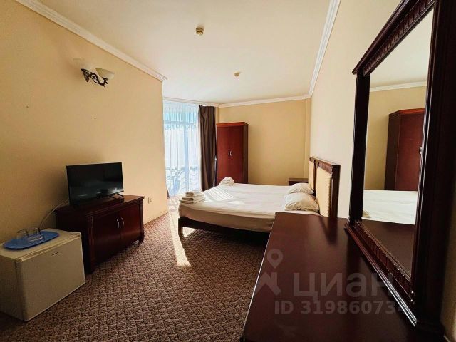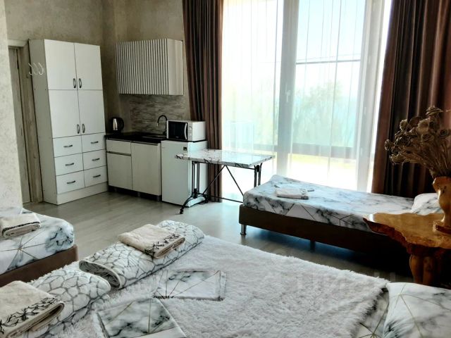 Большой просторный четырёхместный номер, новый ремонт, своя кухня, двухспальная кровать и две односпальные кровати, новые жк тв, холодильник, кондиционер, имеется фильтр для воды, чайник, фен. Потолки 3 метра, панорамное окно 33 метра из которого открывается вид на деревья и среди них море.