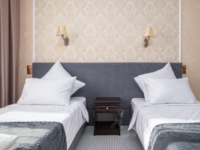 В комнате находятся две односпальные кровати (либо одна 2х спальная), аккуратно были расположены рядом, с удобными матрасами и свежим постельным бельем. Рядом с кроватями прикроватные тумбочки с лампами для чтения.