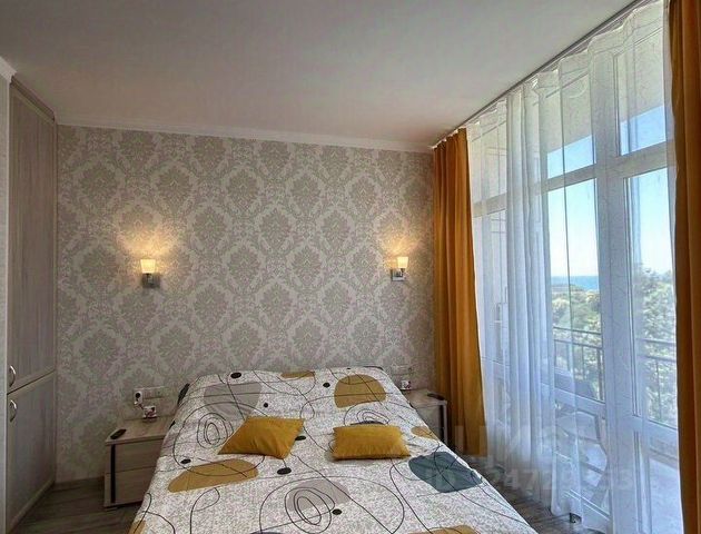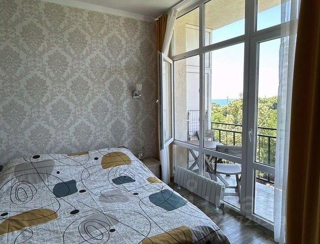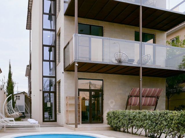 1-ый этаж,отдельный вход, крыльцо,лавочки для отдыха.Окно квартиры Выходит во двор территории, вид на море и город-с другой стороны фасада(террассы) дома.
